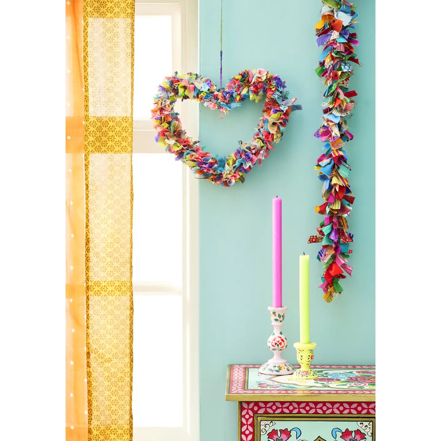 This fancy fabric heart wreath is hand crafted from a mixture of offcuts with deep colour flashes and textured finish combining to give a homely feel.