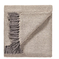This hand loomed zig-zag patterned throw with dark grey tassel fringing is cosy in breathable cotton.