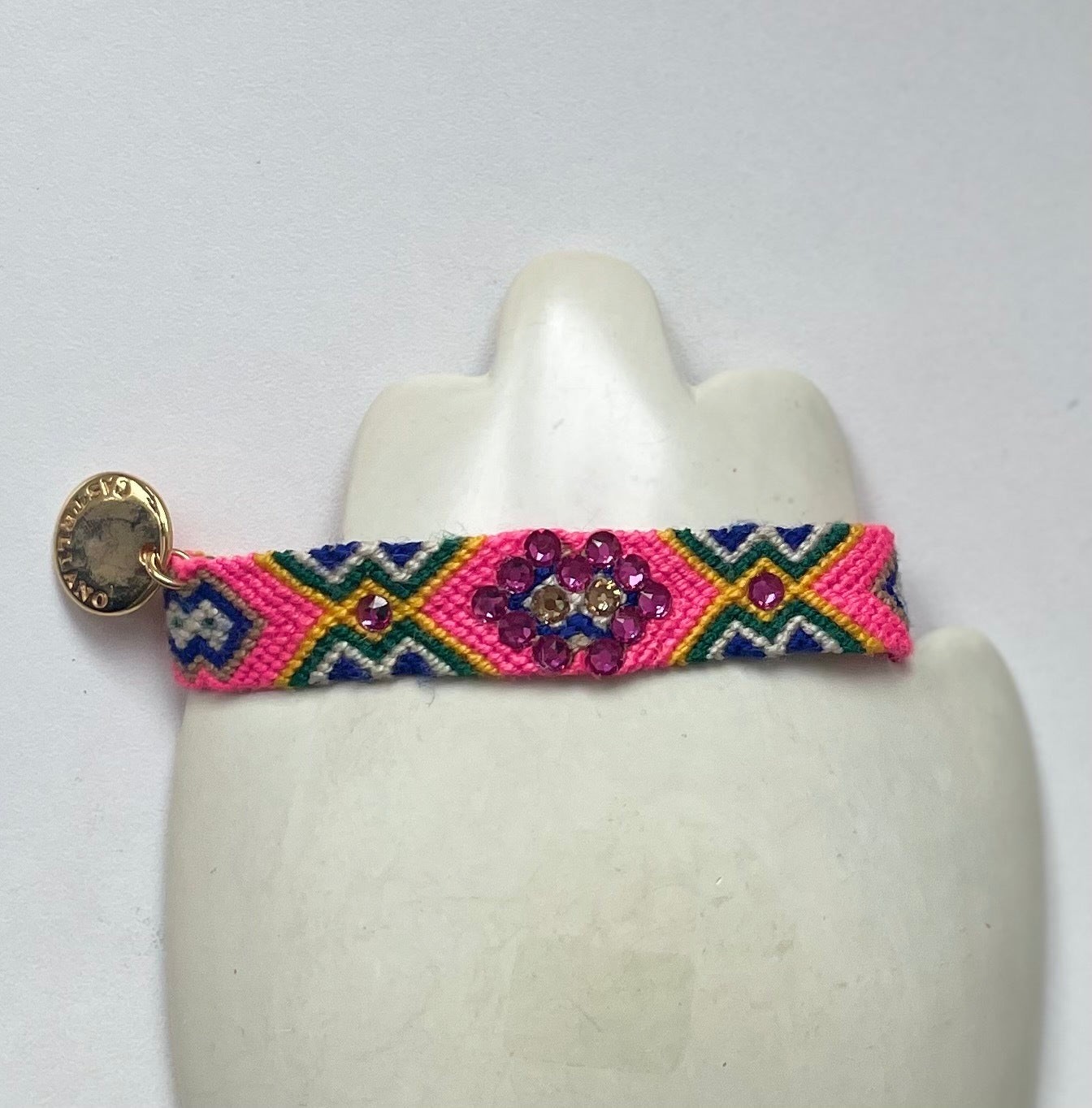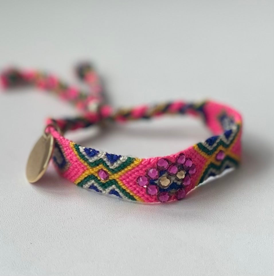 Our Wayuu bracelet features up to 30 Swarovski crystals that shine intensely. Each crystal is meticulously hand-placed, culminating in the centre with a figure that highlights the hand-woven pattern in each Wayuu textile.